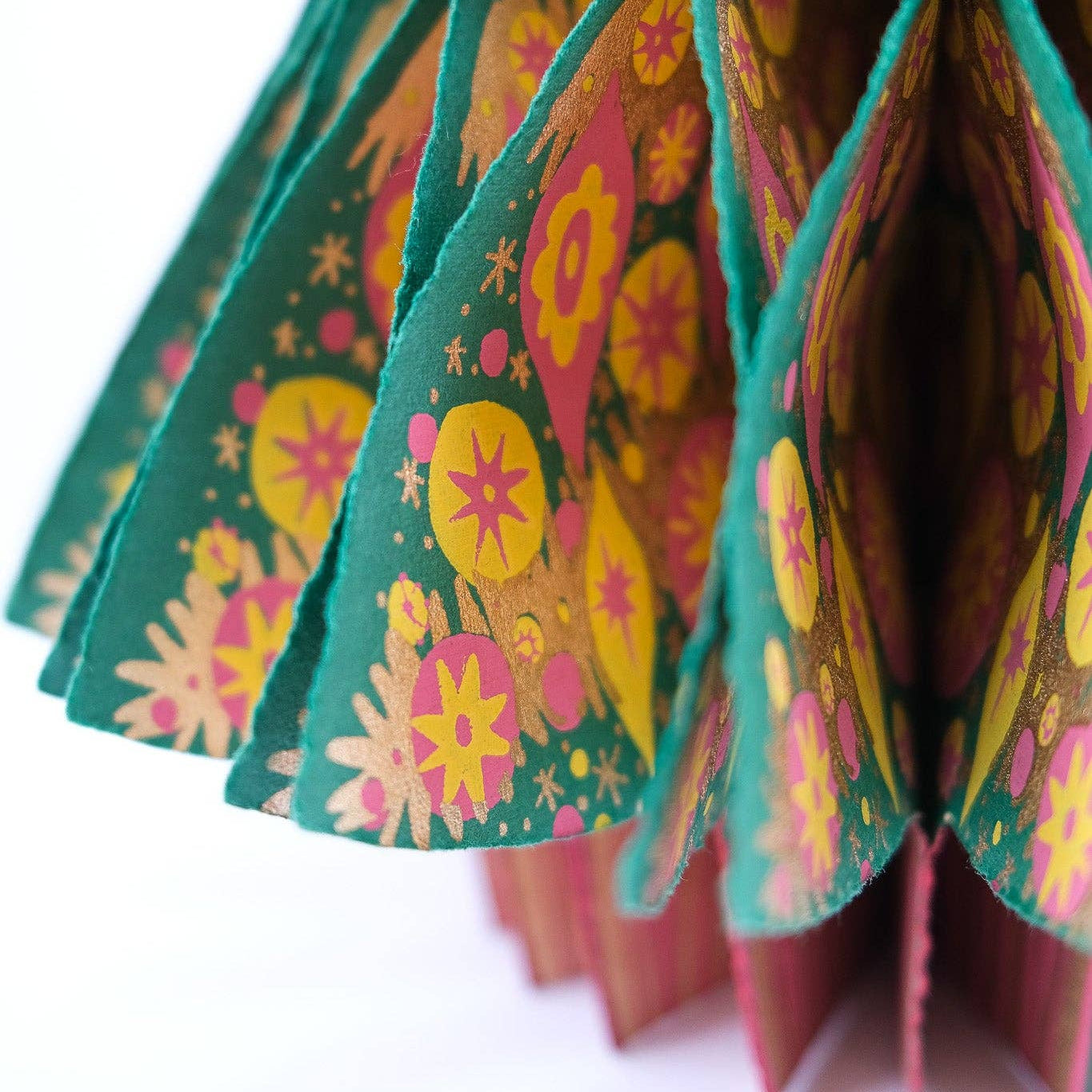 Composed of intricate layers of recycled cotton paper, each decoration unfolds to reveal a three-dimensional tree honeycomb. Each secured with a magnet. Screen printed by hand by talented artisans in Jaipur and sustainably made from recycled materials. Measures 14" tall.