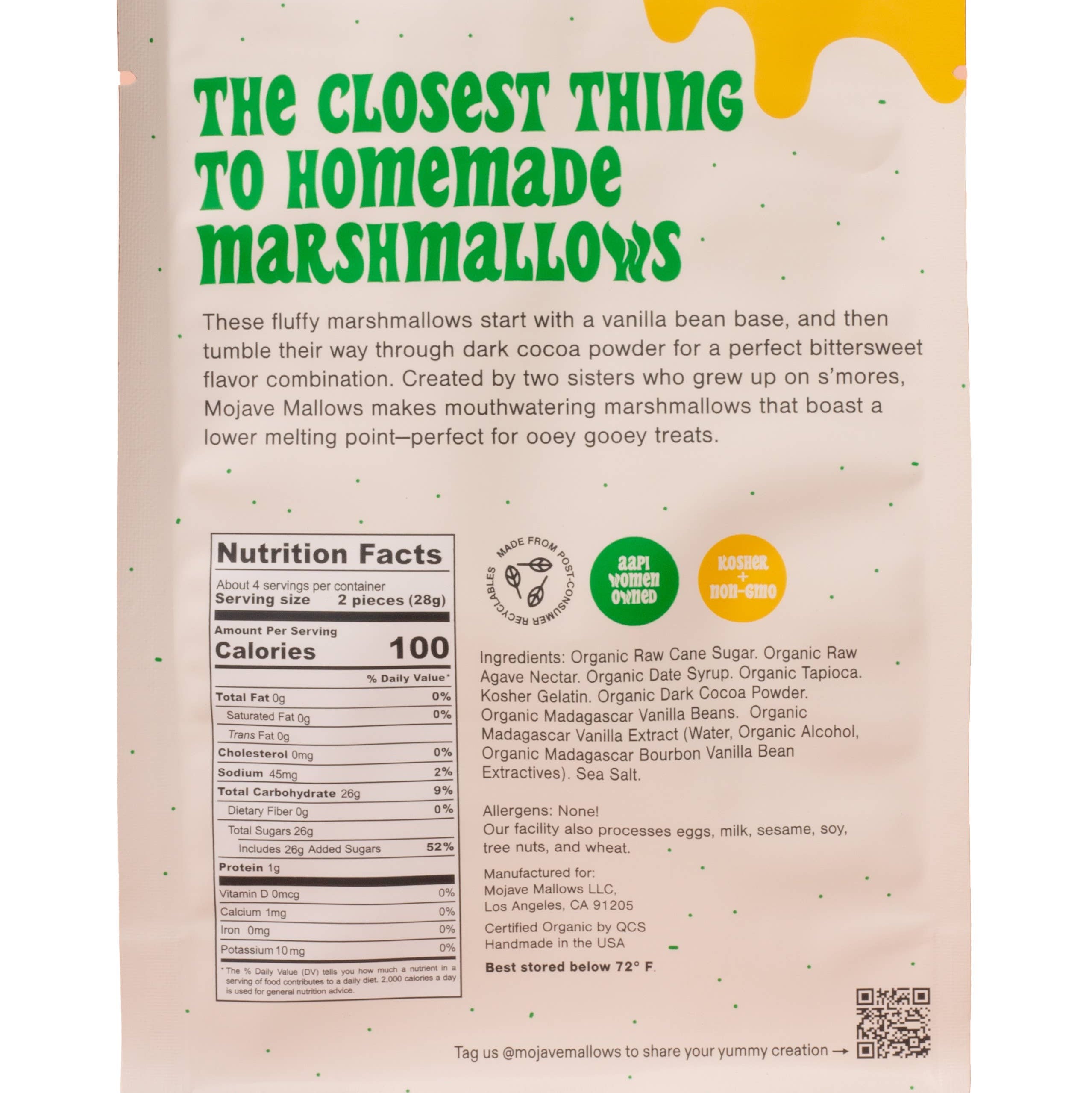 ABOUT THE MAKER: Founded by two former girl scouts, Mojave Mallows is the only organic marshmallow on the market. We use wholesome dates and agave to give our super soft marshmallows a lower melting point and unreal taste that grownups love too.