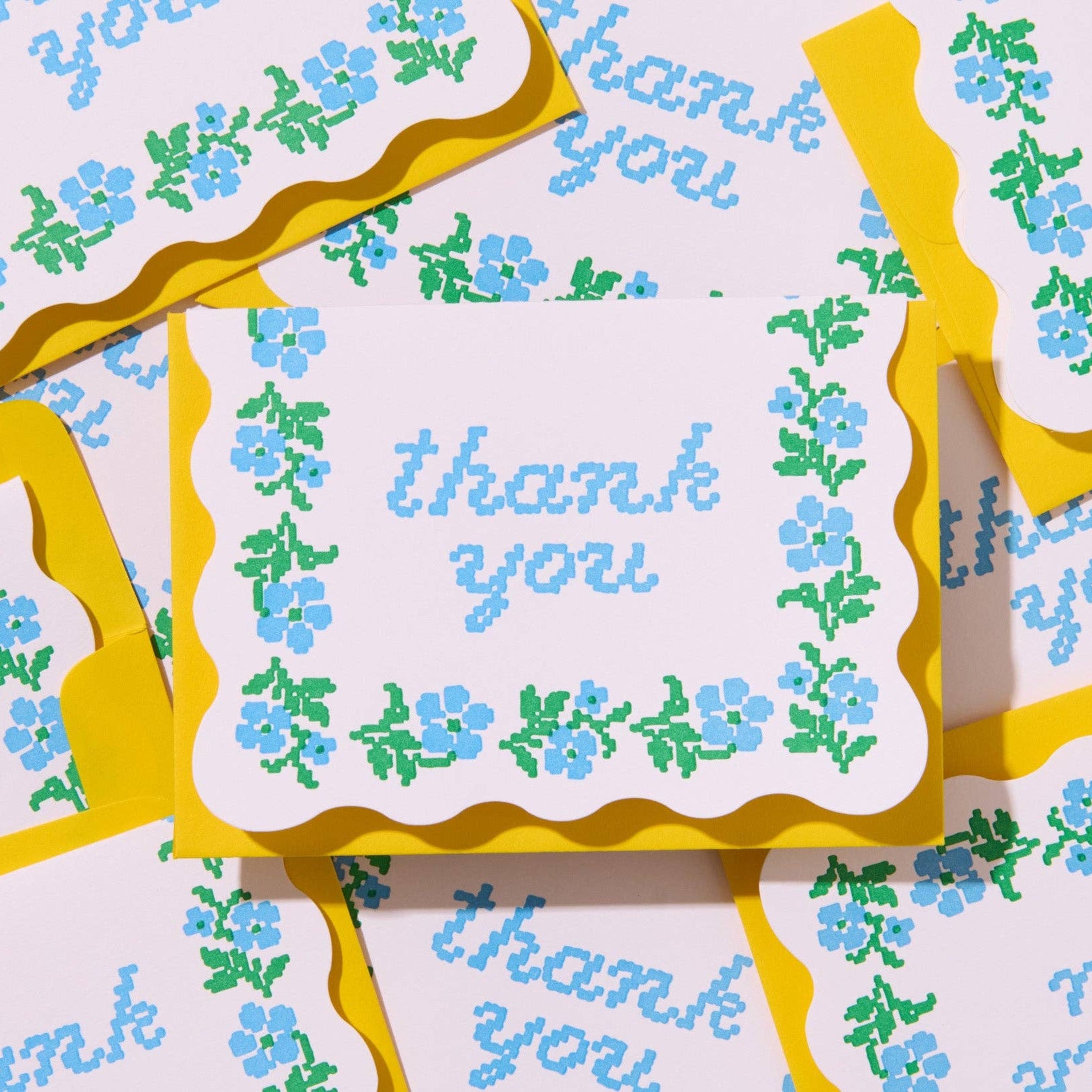A set of 10 delicate, cross-stitched blank flower thank you cards, with a scalloped edge—sweet, simple, and just the right amount of cozy. Artwork by Meghan Hopkins Sokorai.