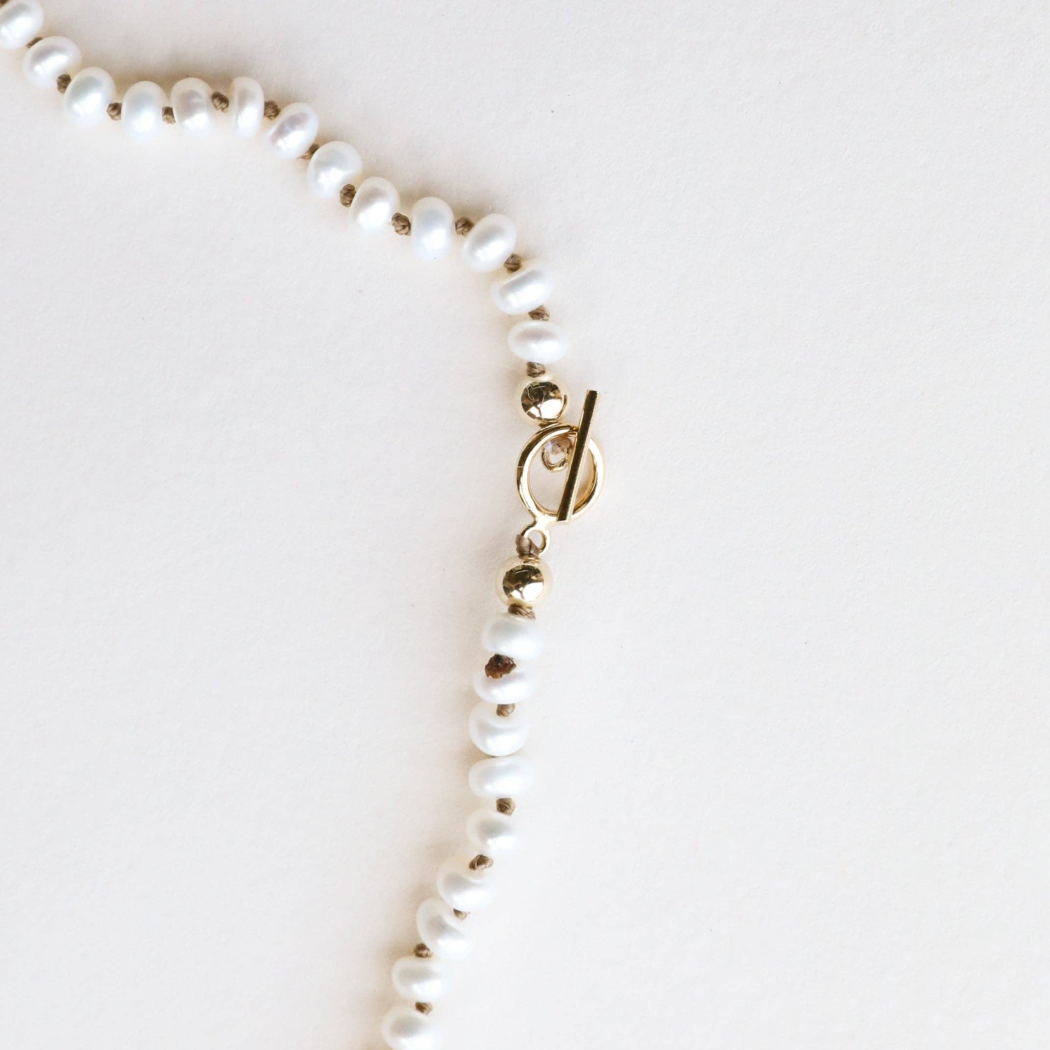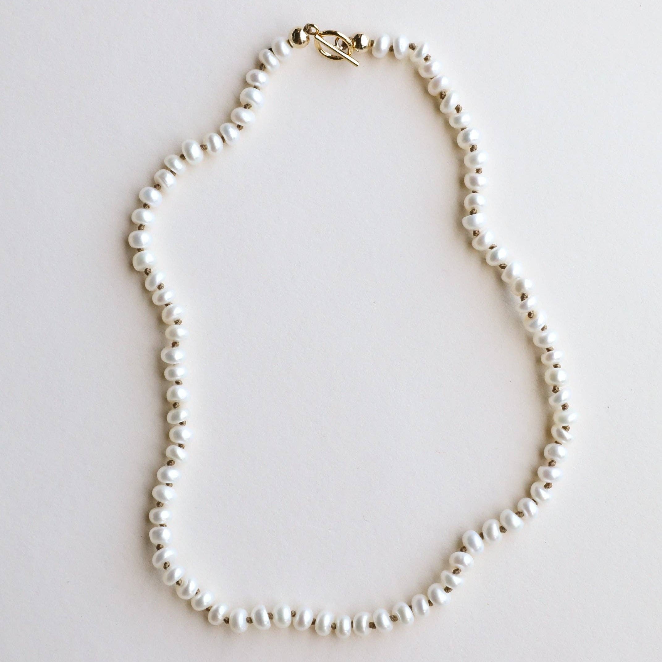This classic piece is pure + simple, just how we like it. Each piece is artfully hand knotted with 5mm Genuine Fresh Water Pearls and finished with a 14K Gold Filled Toggle Clasp. Handmade + ideal for charms too! All they need is you. 17" Length.