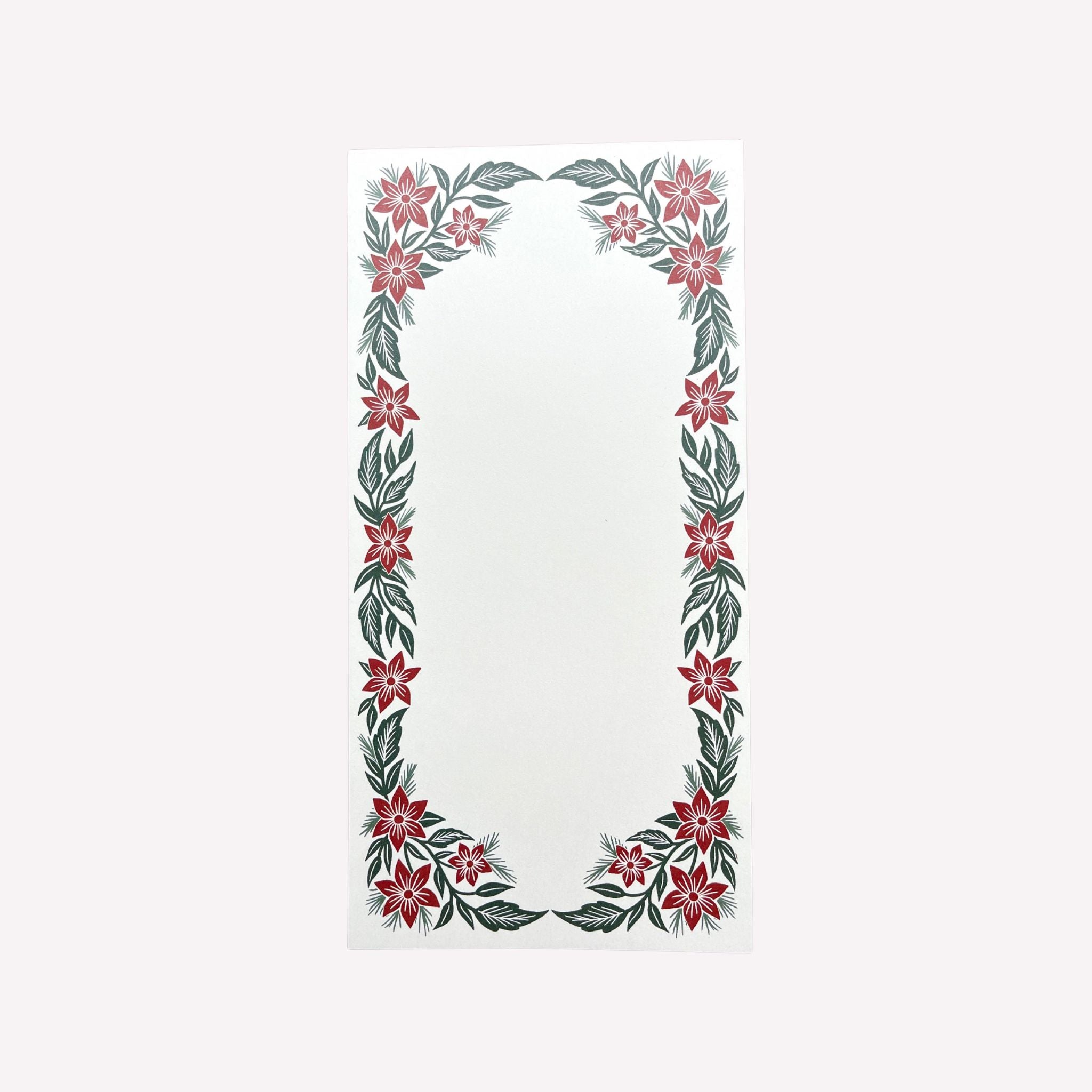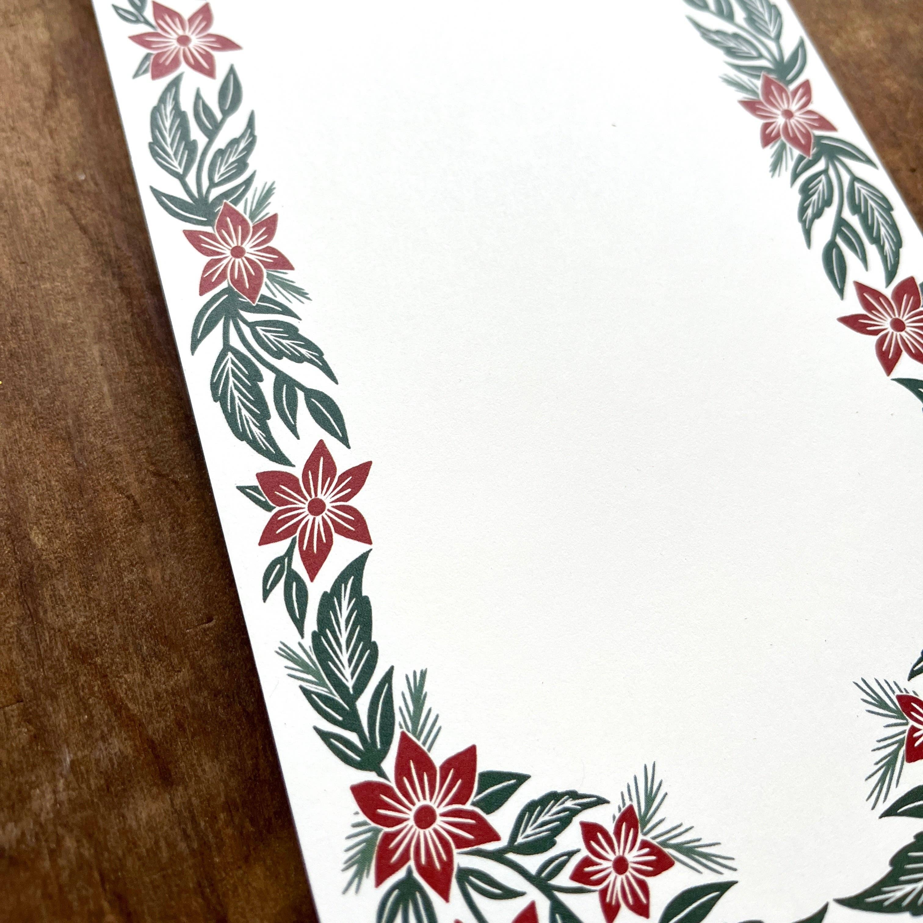 A Katharine Watson floral notepad, perfect for grocery lists or note-taking. Each notepad is 4.25" x 8.5" and features 50 decorated pages with thick, high-quality cream paper.