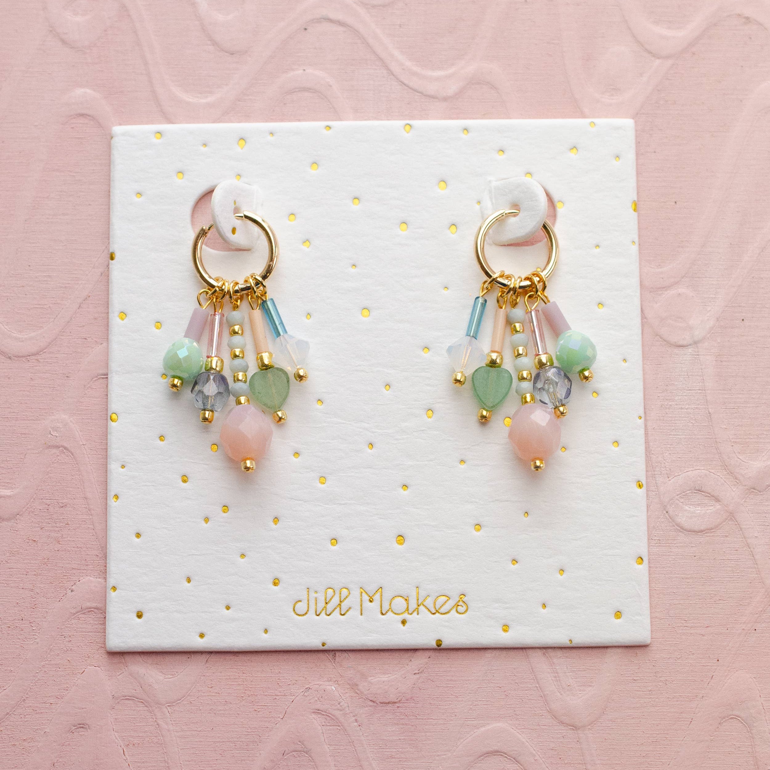 These sweet earrings are made with an assortment of glass beads and charms. Hoops are 14mm gold-plated over stainless steel. Measures approx, 1.5" long.
