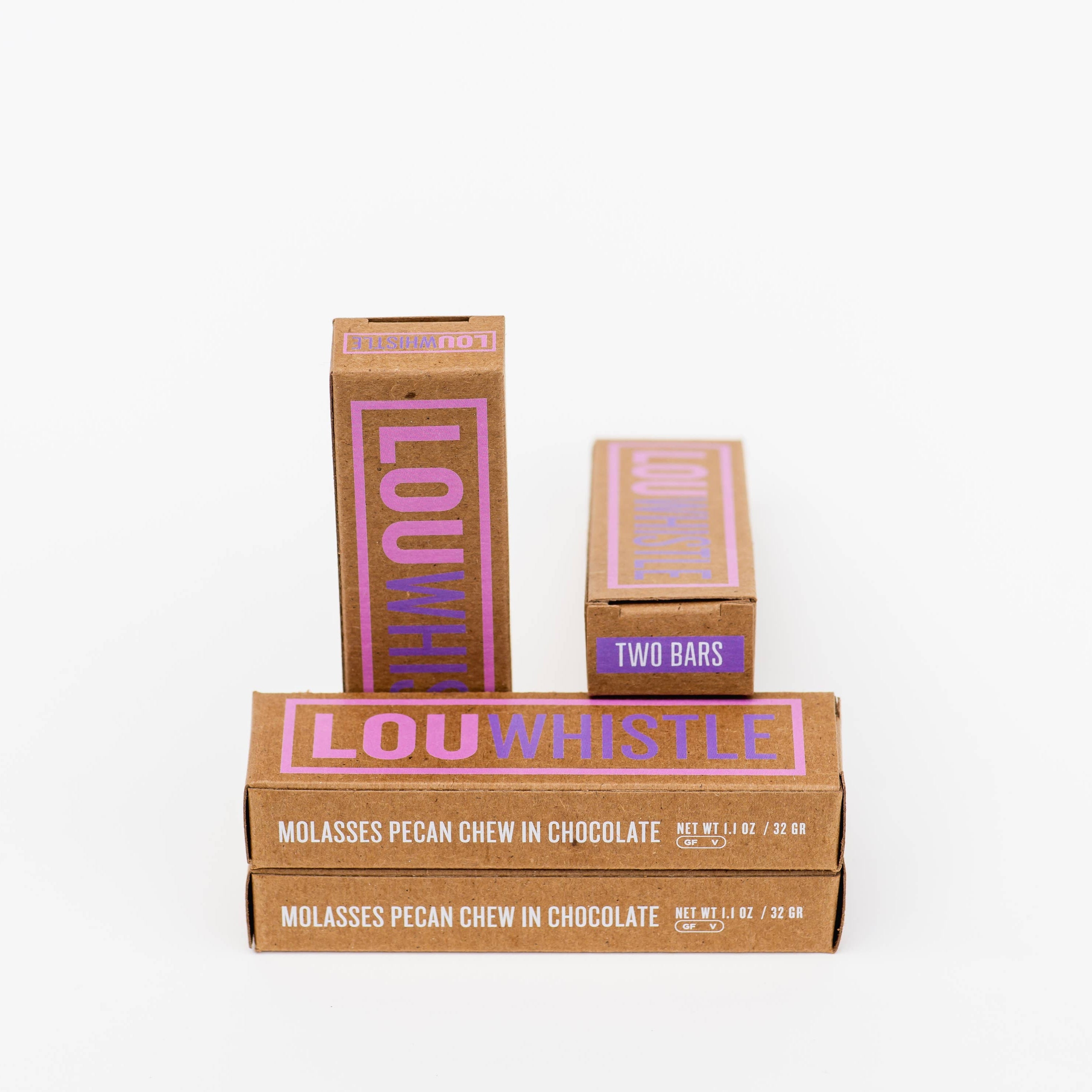 Lou Whistle Molasses Pecan Chew Covered in Dark Chocolate. Molasses and pecans come together in a luxe chocolate wrapper and deliver flavors of buttery pecan pie in a soft and satisfying chew, without any dairy at all. We’ve put two little two-bite bars into an adorable box for rich a treat now, and another one later, or for sharing with a friend. Lou Whistle loves coffee and chai, bourbon and rum, zinfandel and cider. In this candy, we’re festive and refined, well-heeled and familiar. 2 bars per box.