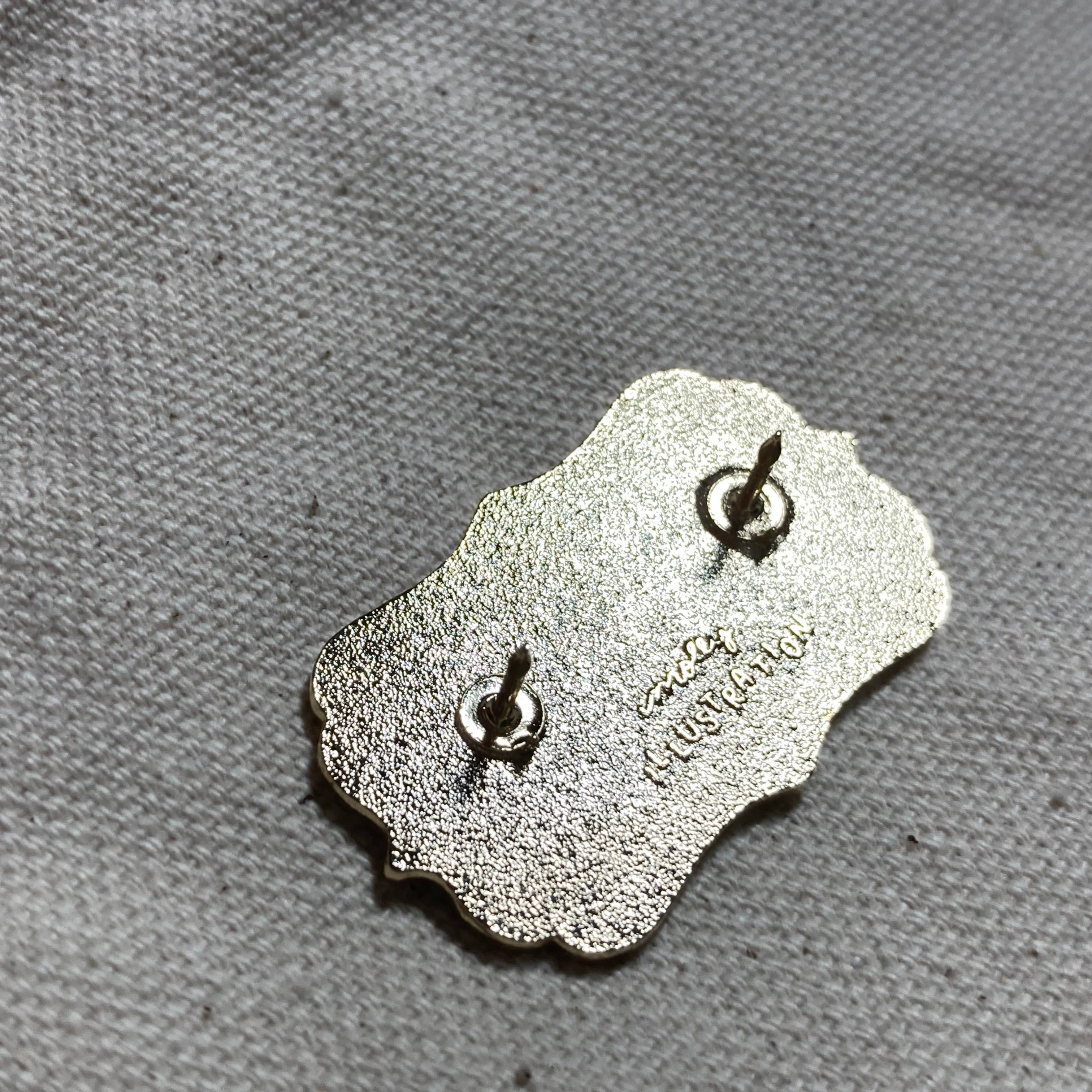 Pin is made of hard enamel and features two backing posts with rubber clutch pin backs. 1.25 inches wide