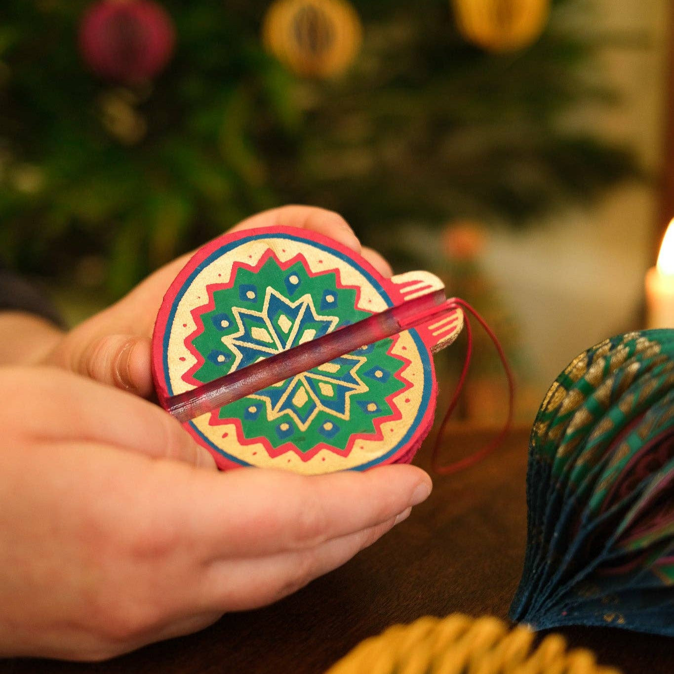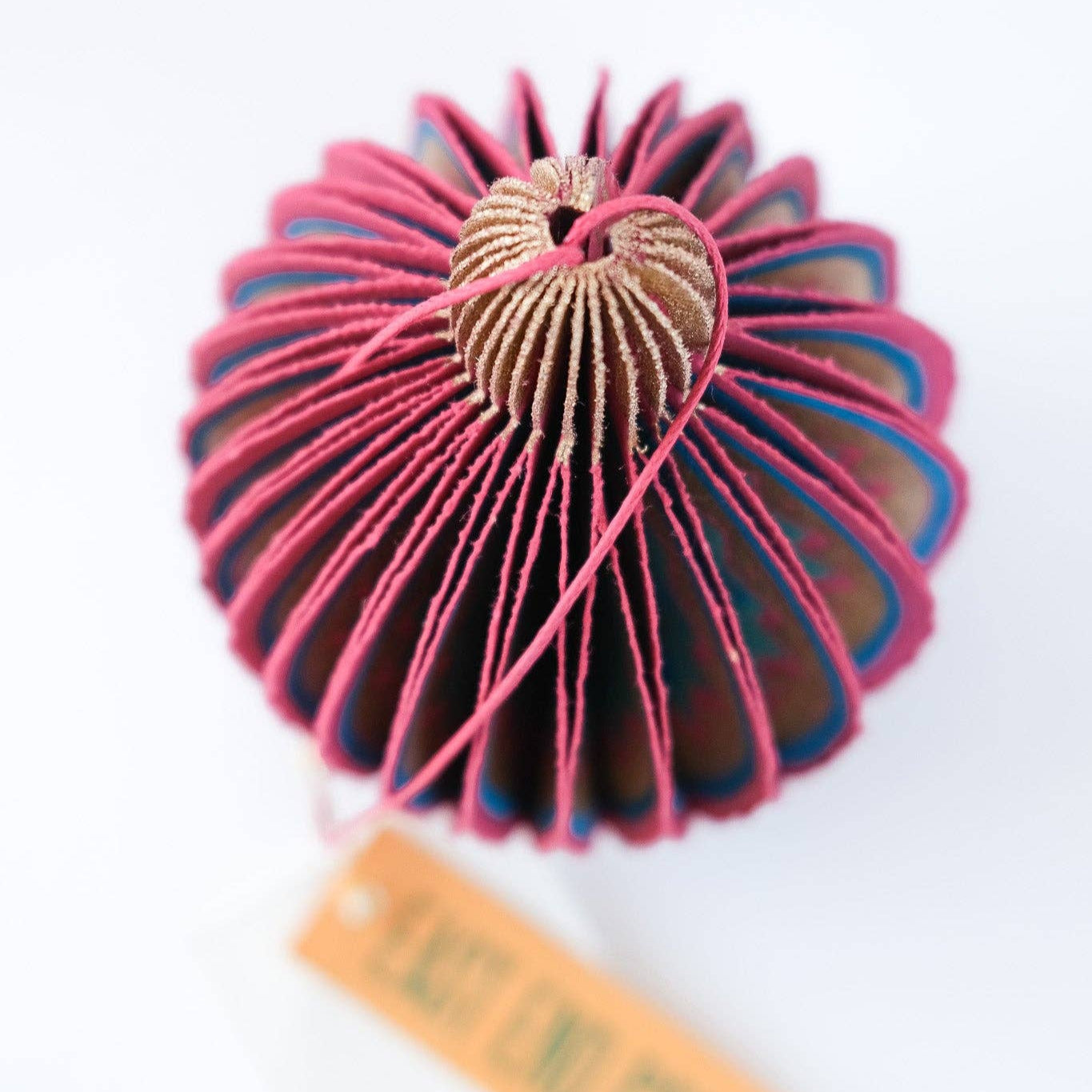 Composed of intricate layers of recycled cotton paper, each decoration unfolds to reveal a three-dimensional bauble honeycomb on a cotton hanging loop.