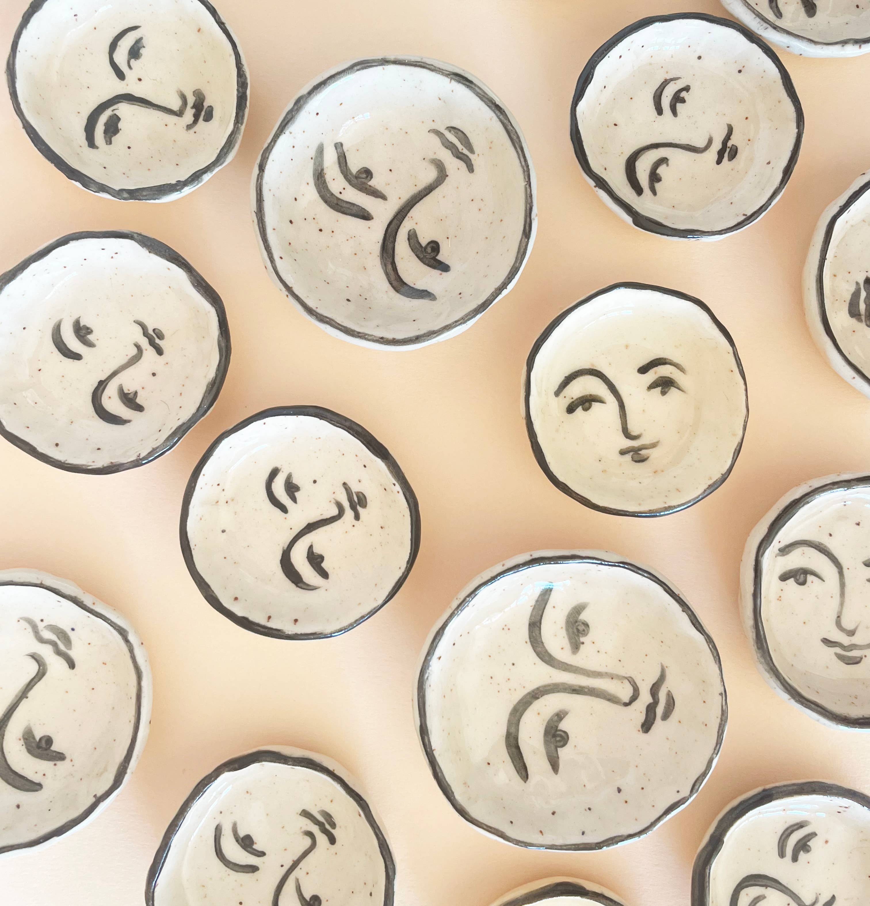 A small handmade and hand-painted trinket dish that has a soul of its own. Each one is uniquely illustrated with a delicate yet expressive linework depicting a friendly face. Due to the handmade nature of this item, each dish will have its own character and may differ from the photo. White Speckled stoneware, approx. 2"x2"