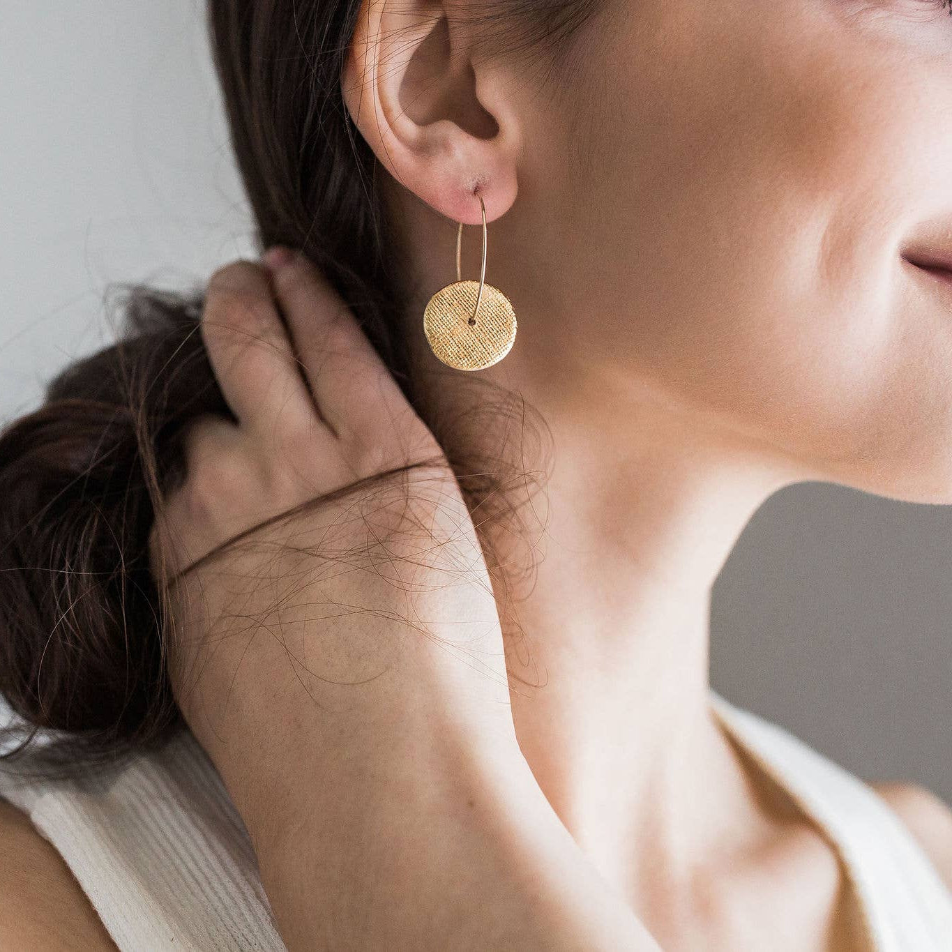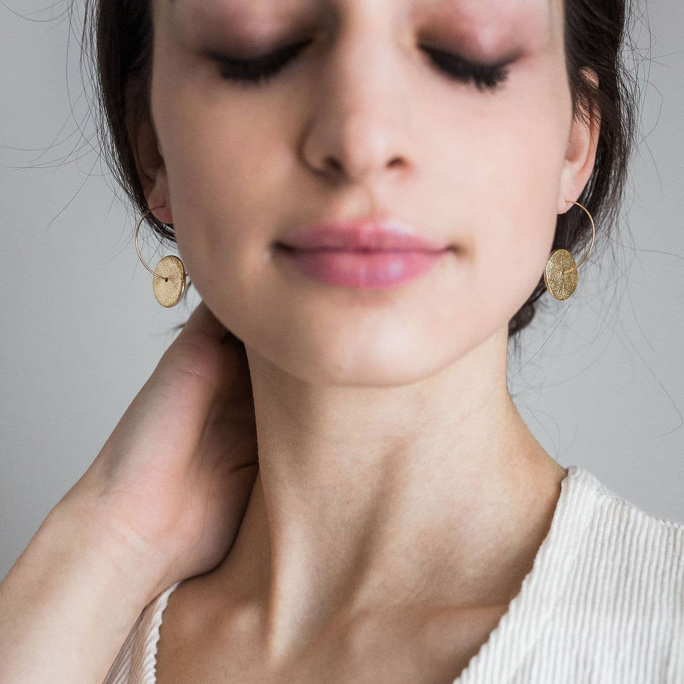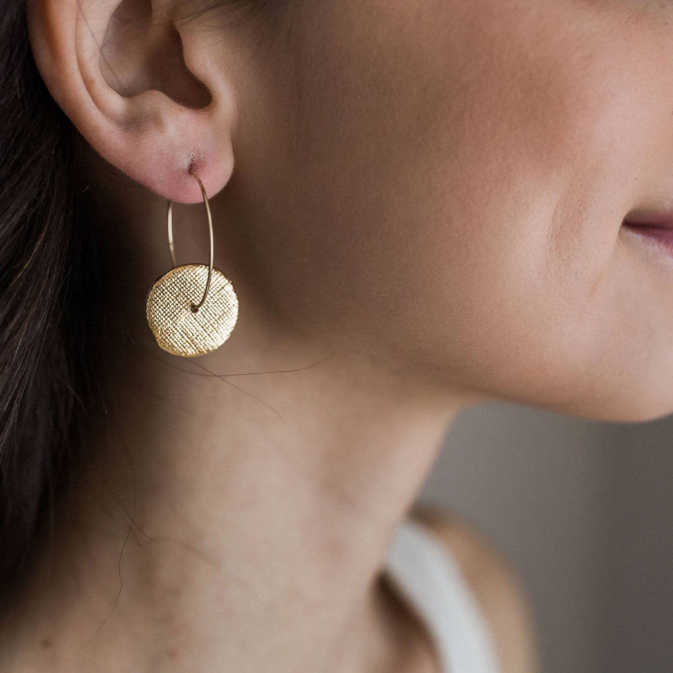 Handmade and comfortable, these lightweight earrings have a unique and modern look. Thin, round, textured porcelain pieces with gold luster hang loosely from 1” hoops. While the backs are raw, white porcelain the textured, brassy gold surface of the fronts reflect light beautifully. Because each pair is handmade and unique, the shape, size and pattern of the product you receive may vary slightly from what is pictured here.
